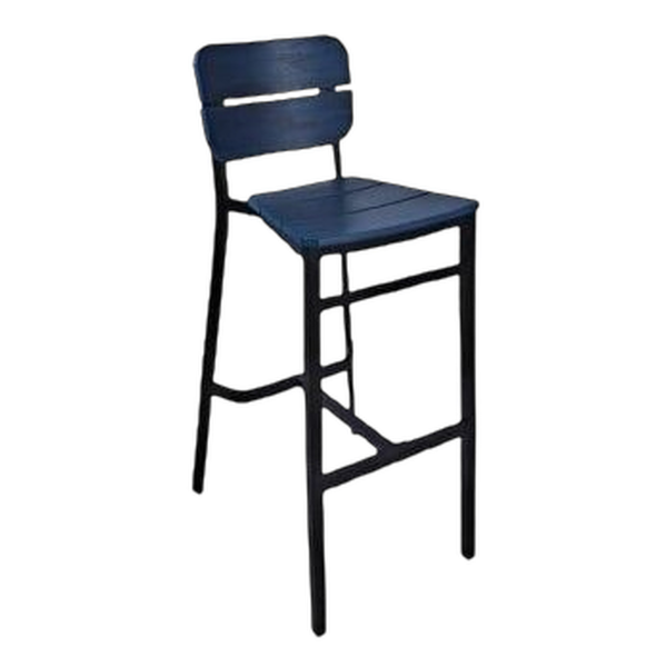 Opis: Barski stol Polo je zasnovan za profesionalno uporabo v gostinskih, hotelskih in drugih javnih prostorih. Aluminijasto ogrodje v elegantni črni barvi zagotavlja stabilnost in odpornost proti vremenskim vplivom, medtem ko sedišče in naslon iz plastičnih letev Pollywood v modri barvi nudita sodoben videz lesa, vendar z večjo vzdržljivostjo in enostavnim vzdrževanjem. Stol je primeren za notranjo in zunanjo uporabo.